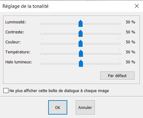 La fenêtre de réglage de tonalité n'est disponible que pour les vues perspective photoréaliste temps réel et finale. Elle apparaît automatiquement en fin de calcul du photoréalisme final mais il est possible de la rappeler à tout moment par la commande du menu déroulant Vue | Réglage de tonalité…