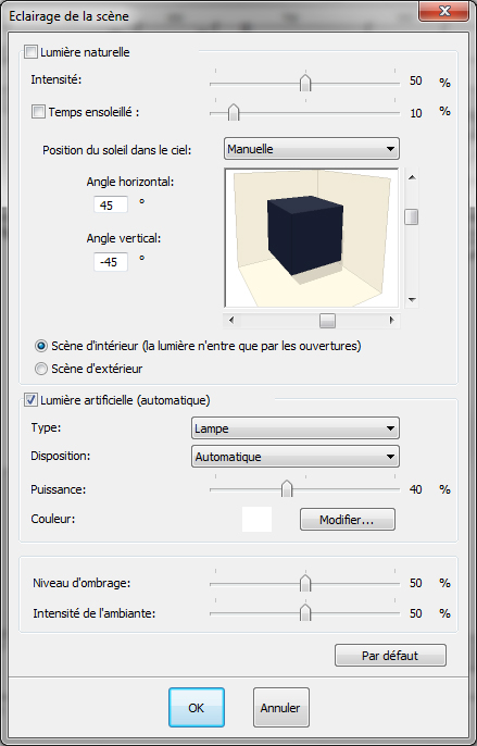 Boîte de dialogue pour l'éclairage de la scène en mode Perspective photoréalisme temps réel En mode "Perspective photoréaliste temps réel", les changements effectués dans cette boîte de dialogue sont visibles immédiatement dans la vue, ce qui permet d'atteindre l'éclairage souhaité très rapidement. Ces réglages sont également valable pour le photoréalisme final. Les modifications liées à l’éclairage se retrouvent via le menu déroulant Scène | Eclairage ou par l'icône