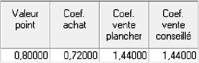 Par exemple : si vous avez 28% de remise fabricant, le Coef. achat doit être de : 0,72. Si vous voulez avoir une marge de 2 en prix de vente, le Coef. conseillé doit être de : (2 x 0.72) 1,44.