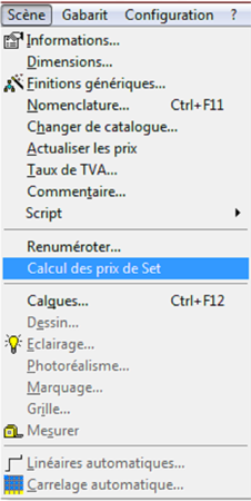 La fonction est accessible dans le menu déroulant : Scène | Calcul des prix de Set.