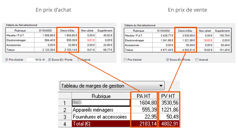 Les valeurs des cellules Devis InSitu du module de calcul de set, en prix d’achat ou prix de vente, doivent correspondre aux cellules HT dans la vue chiffrage d’InSitu, rubrique Tableau de marges de gestion, comme illustré ci-après.