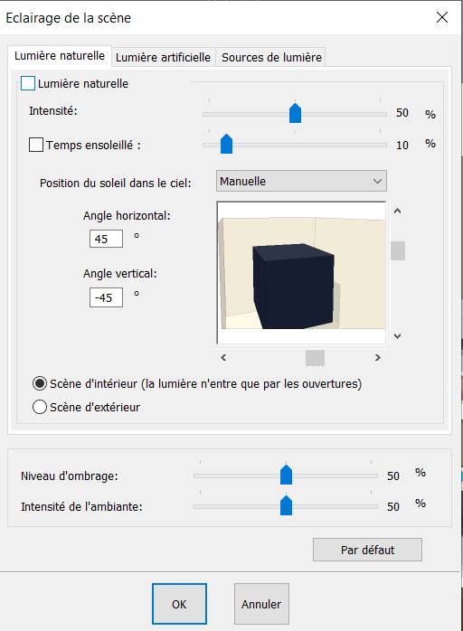 Enfin, il est possible de choisir l’intensité des sources de lumière, soit pour chacune d’entre elles,soit pour l’ensemble des sources de lumière présentes dans la scène grâce au curseur Intensité. | |||