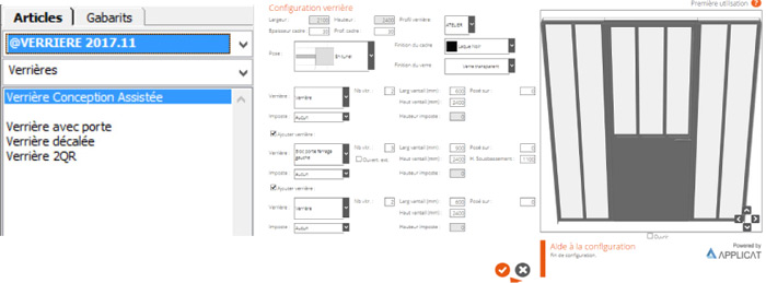 2 - Référence de l'article avec sens d'ouverture de la fenêtre ( G ) ou ( D ) 3 - Bouton de pose de la fenêtre sur la scène 4 - Bouton permettant de relier l'objet à un autre élément 5 - Bouton de remplacement de l'article par un autre 6 - Bouton d'altitude de pose par rapport au bas du mur ou du haut du mur 7 - Bouton de pose en distance par rapport a la droite du mur ou a la gauche du mur