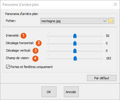 panorama qui s’affiche à 360° derrière les ouvertures de la scène. Vous n’aurez plus à gérer l’ajout d’images derrière chaque fenêtre. | panorama qui s’affiche à 360° derrière les ouvertures de la scène en vue 3D. Vous n’aurez plus à gérer l’ajout d’images derrière chaque fenêtre. | ||