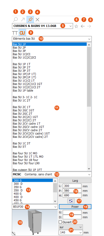 Légende 1 - Icône de recherche de l’article de référence 2 - Icône permettant de détacher la fenêtre de pose 3 - Icône permettant d'épingler la boîte de pose 4 - Icône permettant d'enlever l'option "épingler" 5 - Boîte à liste des catalogues 6 - Icône permettant de mettre un catalogue en favori 7 - Icône permettant de revenir au catalogue utilisé précédemment 8 - Icône permettant de revenir au catalogue suivant 9 - Icône permettant d'aller directement sur les catalogues mis en favori 10 - Boîte à liste des chapitres 11 - Zone de liste des blocs 12 - Boîte à liste des modèles ou des finitions 13 - Zone de liste des articles 14 - Boîte à liste du numéro de référence 15 - Zone graphique de prévisualisation de l'article choisi. Il est possible de pré-visualiser l'article choisi en vue de dessus, en perspective ou d’afficher son prix et son libellé. Pour changer de mode de visualisation, cliquez sur le bouton en forme de coin de page plié, repéré I sur le dessin et situé dans le coin inférieur gauche de la zone graphique. 16 - Zones de texte des dimensions de l'article choisi 17 - Icône de remplacement de l’article de référence par l’article choisi 18 - Bouton de validation de la pose de l'article choisi 19 - Zones de texte de positionnement 20 - Case à cocher d’ouverture de l’article choisi 21 - Boîtes à liste de l'altitude de pose de l'article choisi